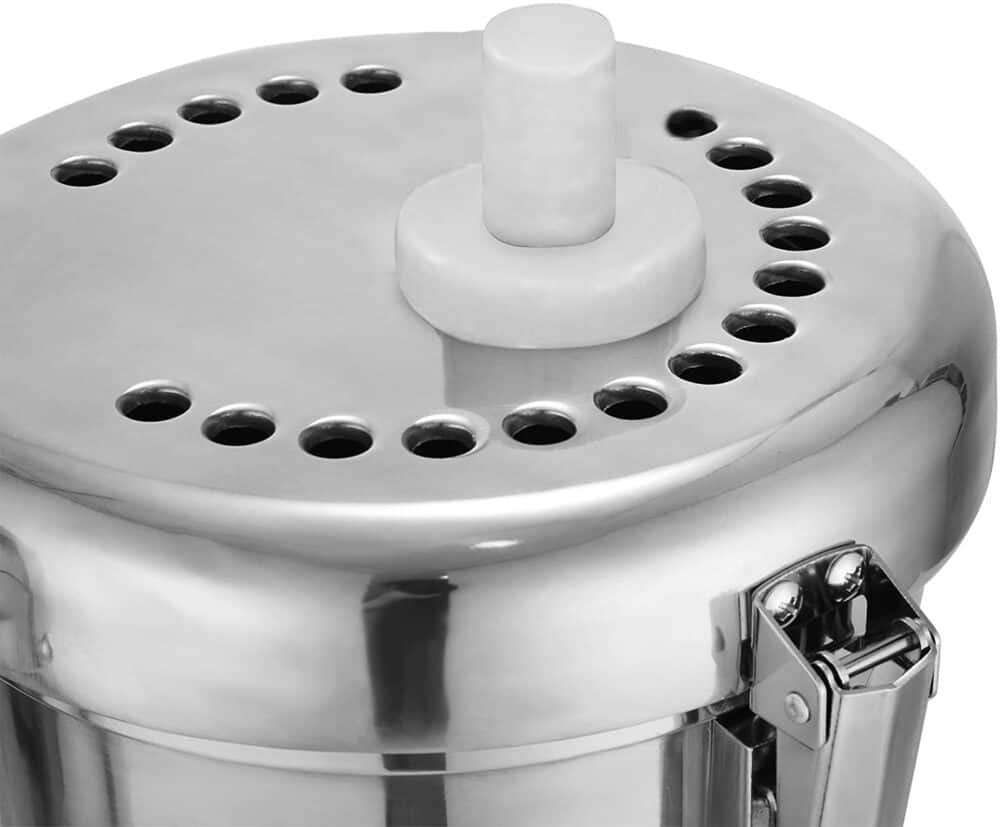 También cuenta con unas hebillas a presión en su tapa para asegurar que quede bien cerrado priorizando la seguridad y evitar algún tipo de perdida de zumo. Este exprimidor puede funcionar de forma continua durante 80-90 minutos antes de que necesite apagarlo y dejarlo enfriar durante 15 minutos.